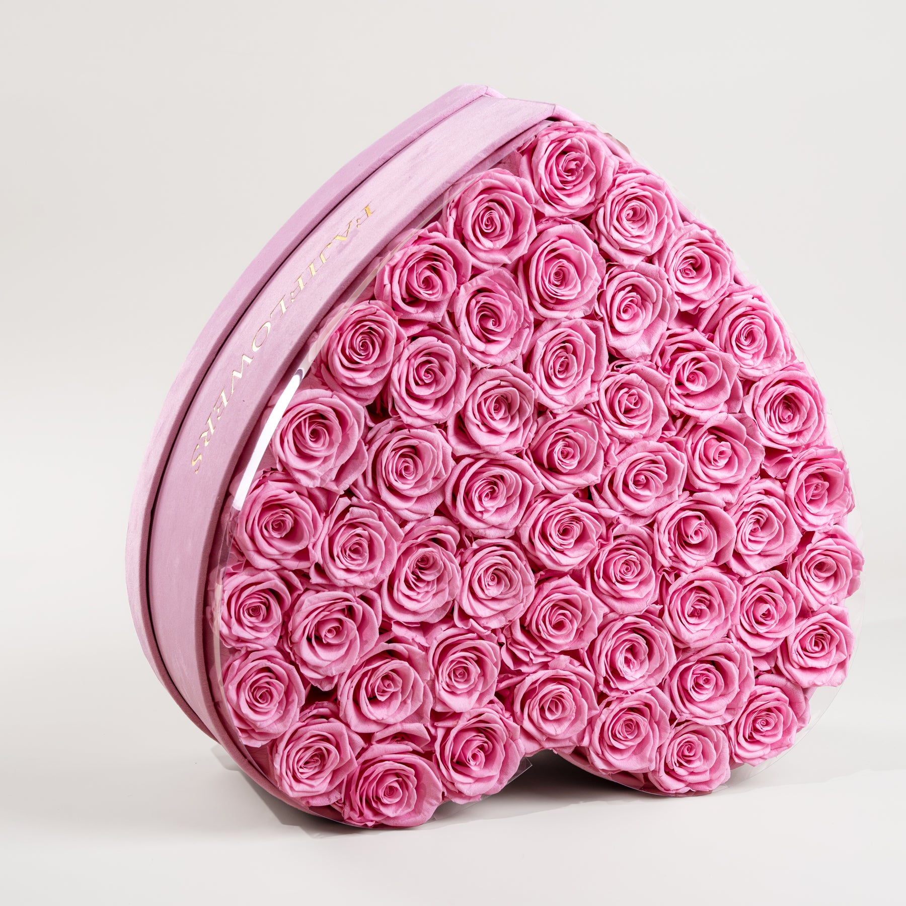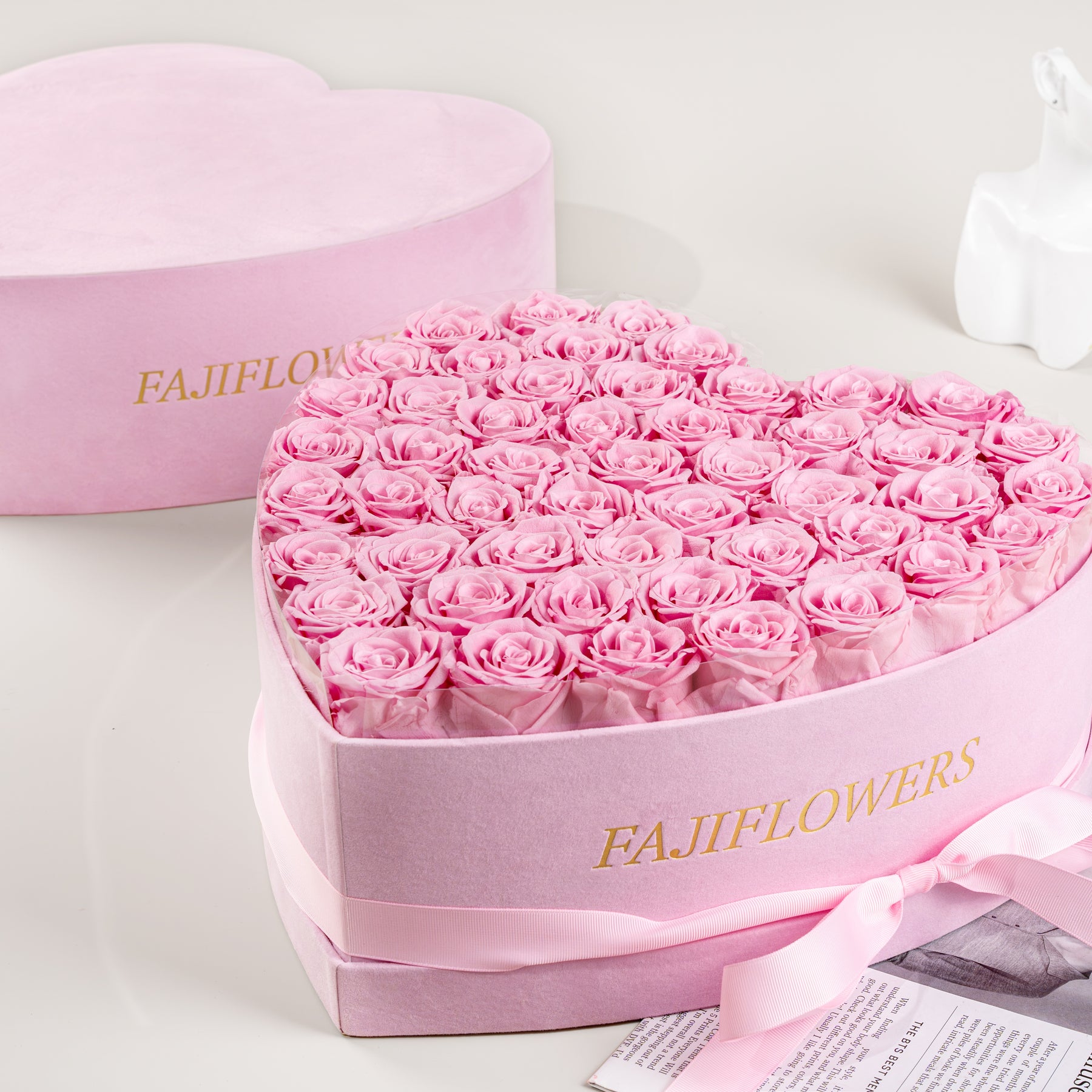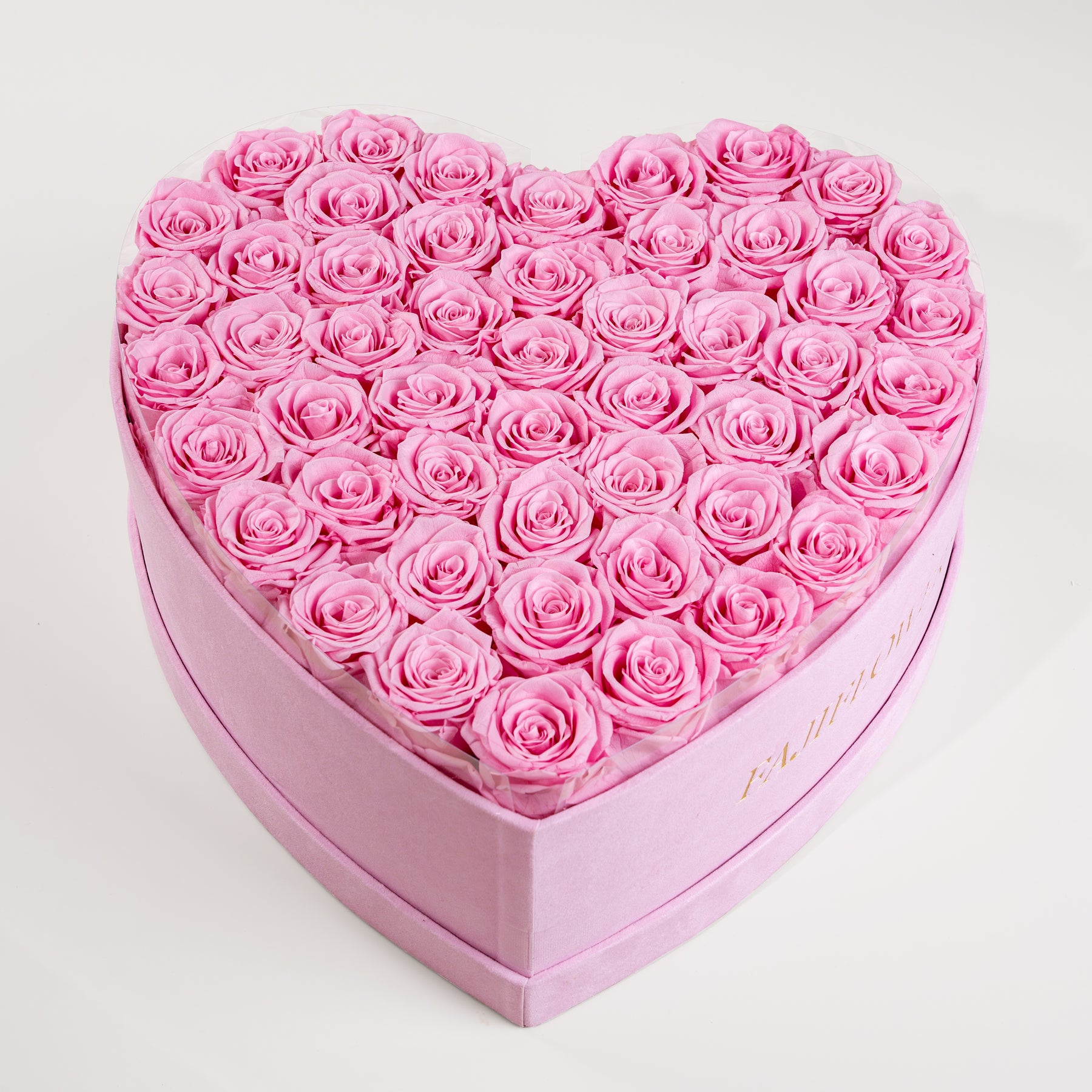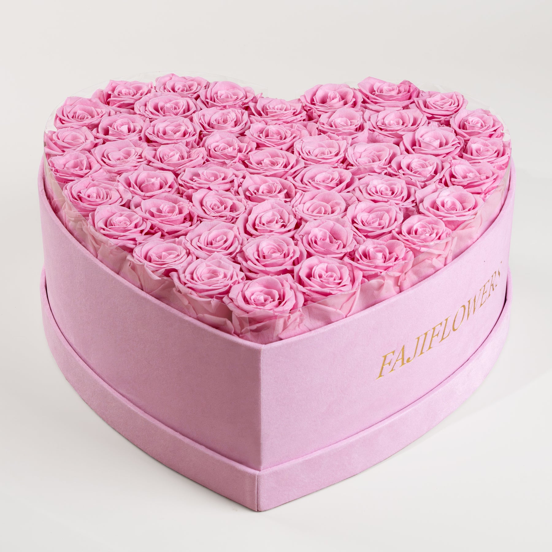 Heart-shaped box of pink roses with FAJI FLOWERS branding on a light background