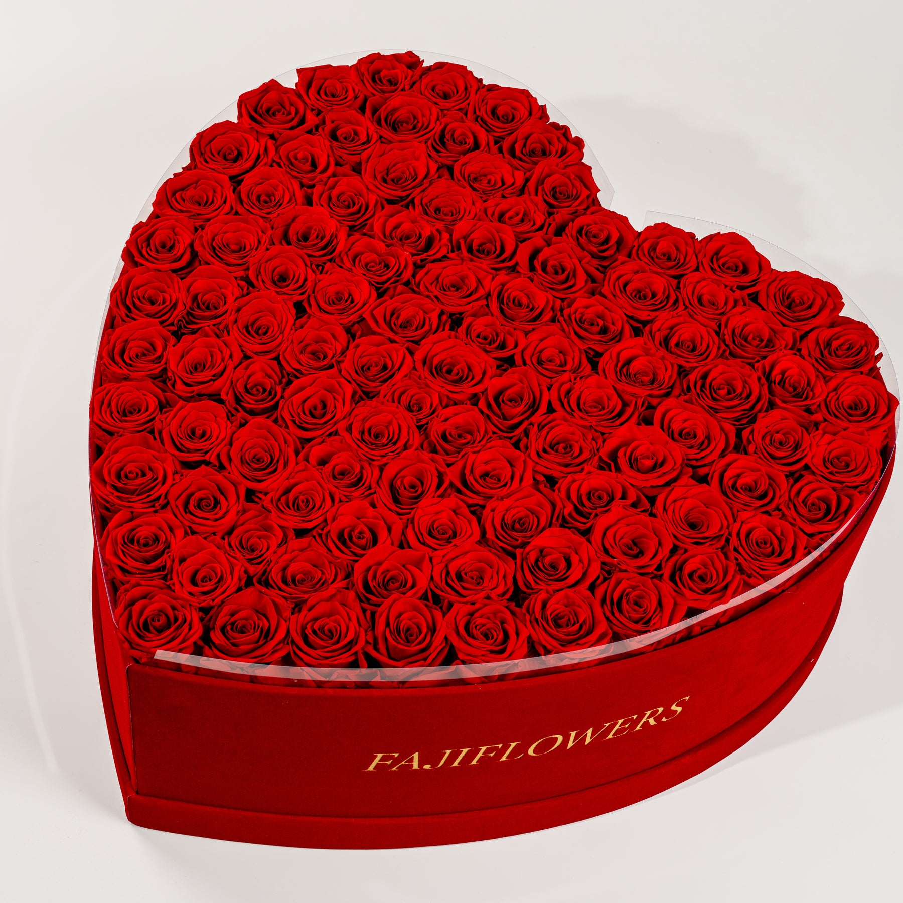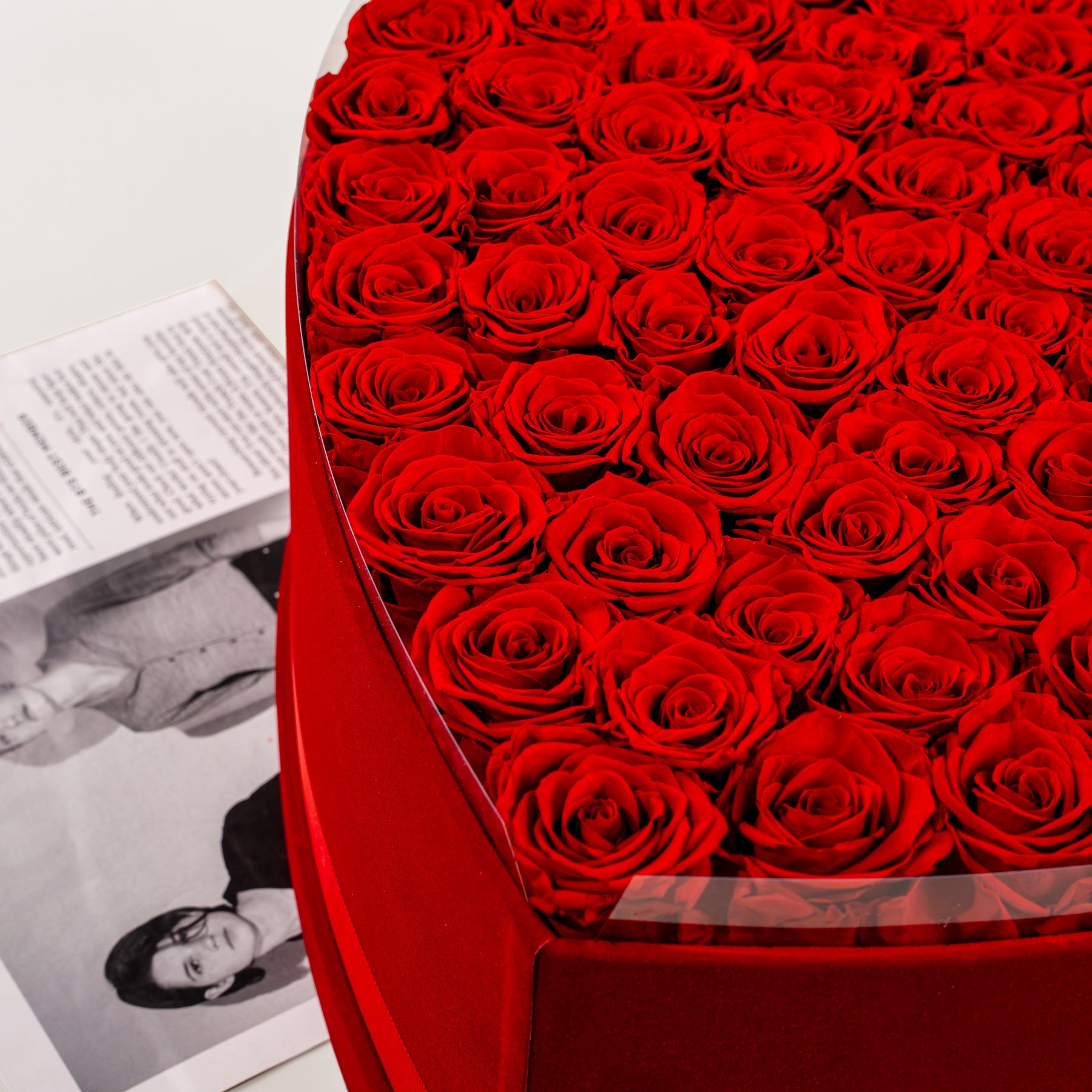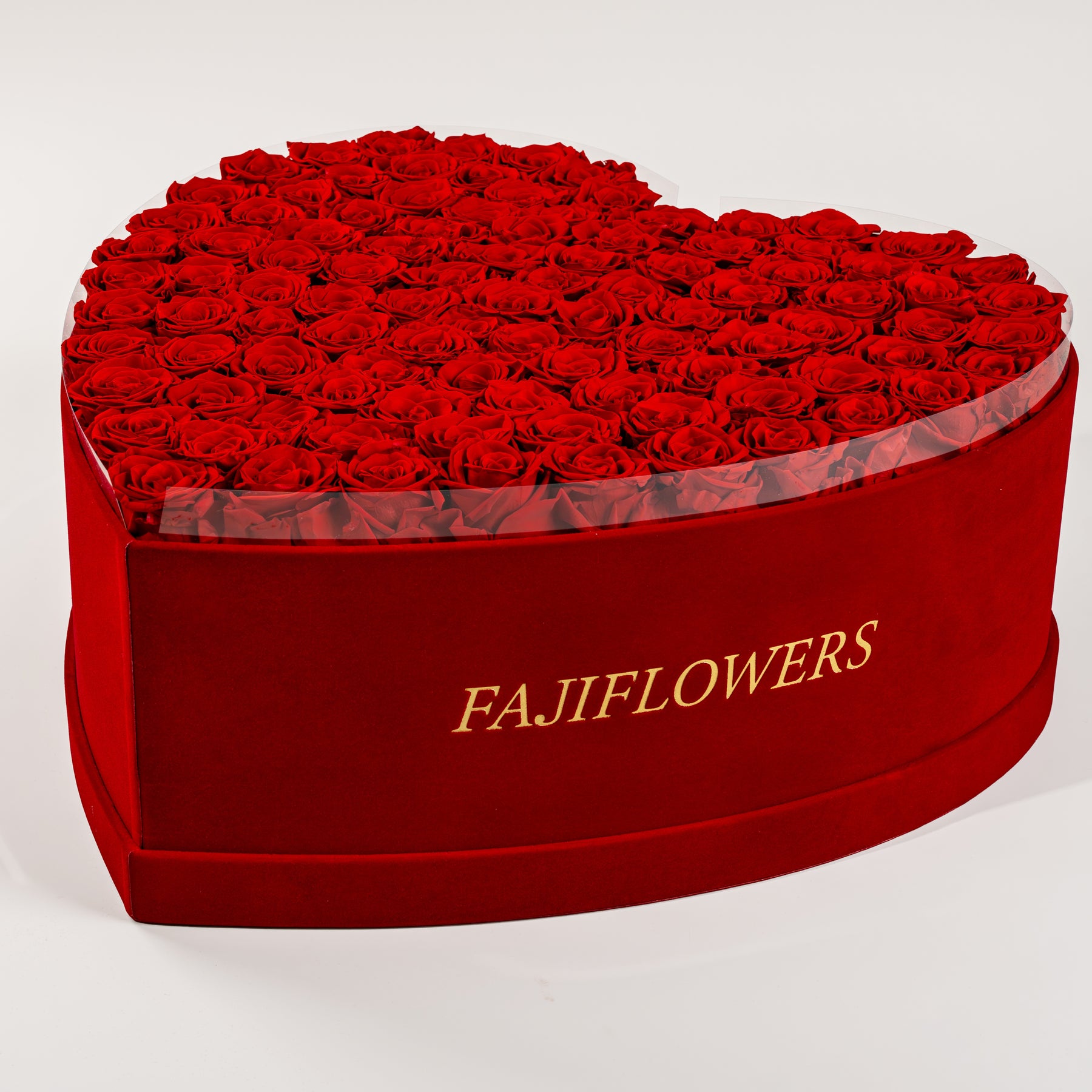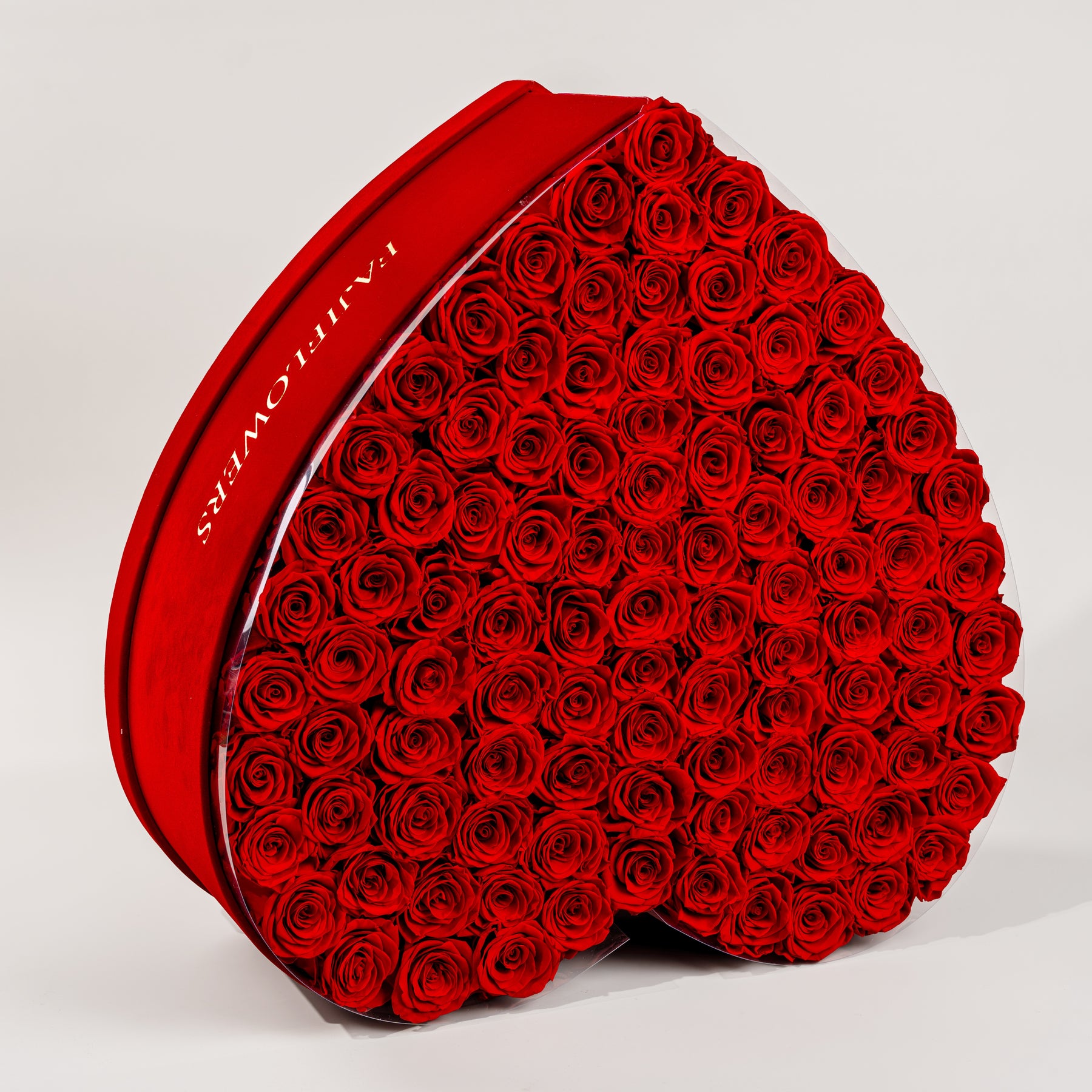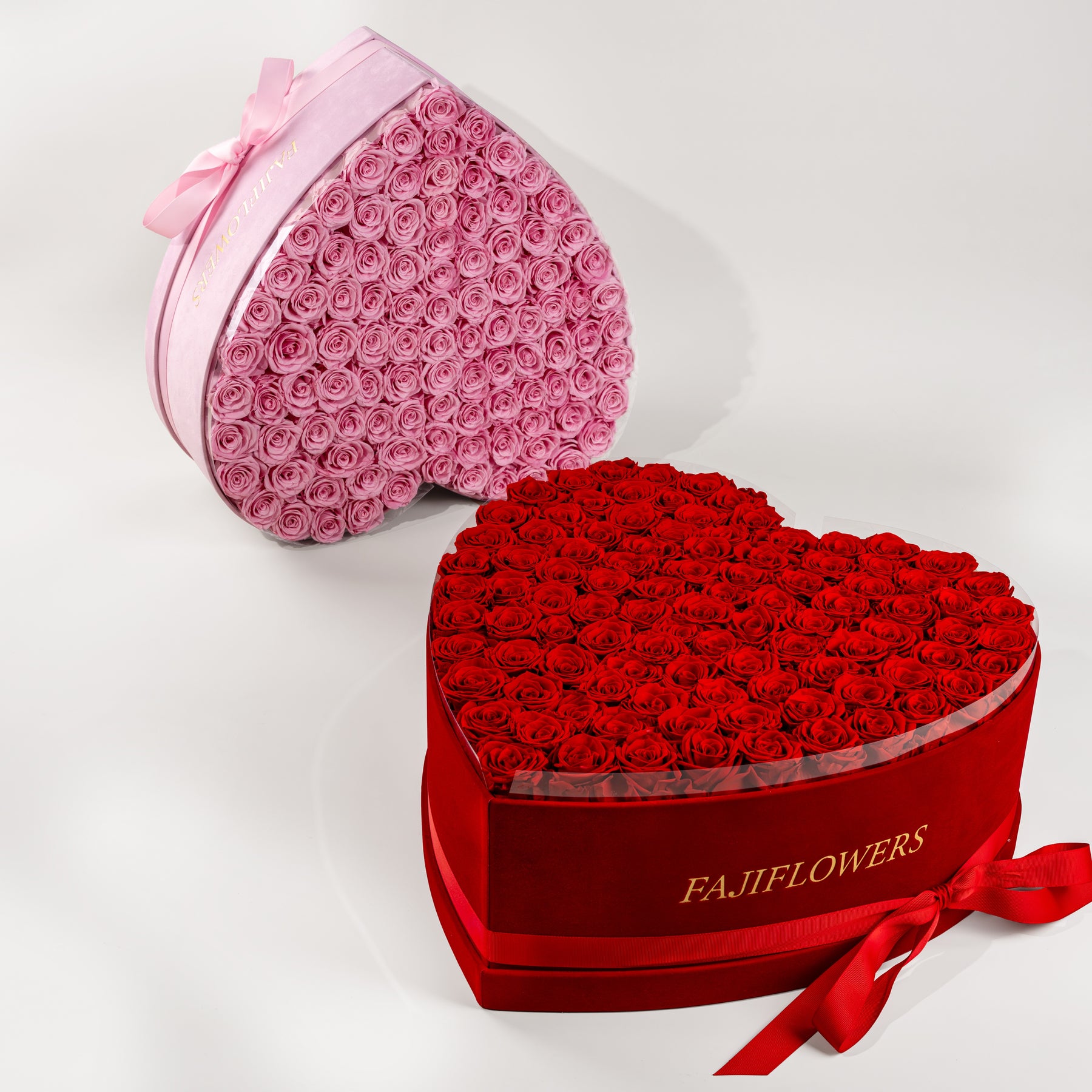 Here is our Limited Edition Heart Shaped Roses for Valentines Day. 100 preserved red and pink. roses gently arranged in a heart shape red suede box to resemble the emotion and symbol of Love