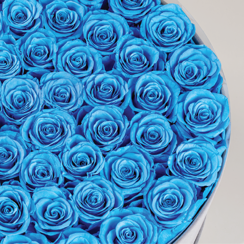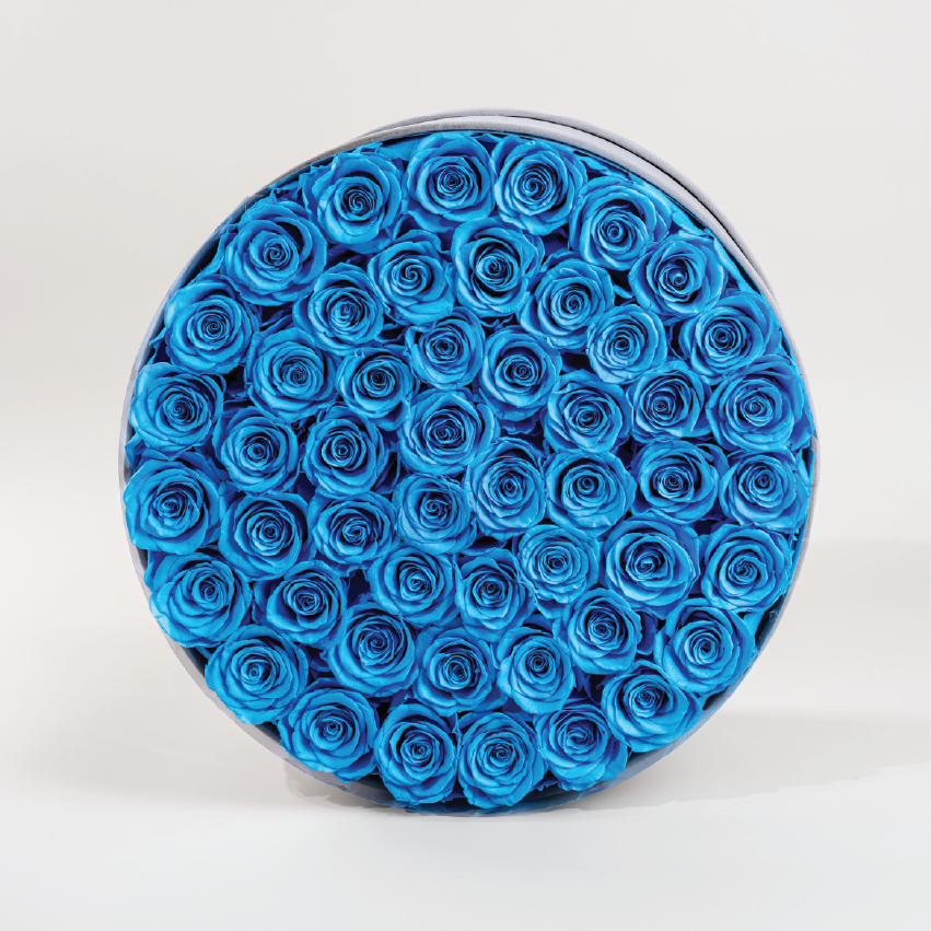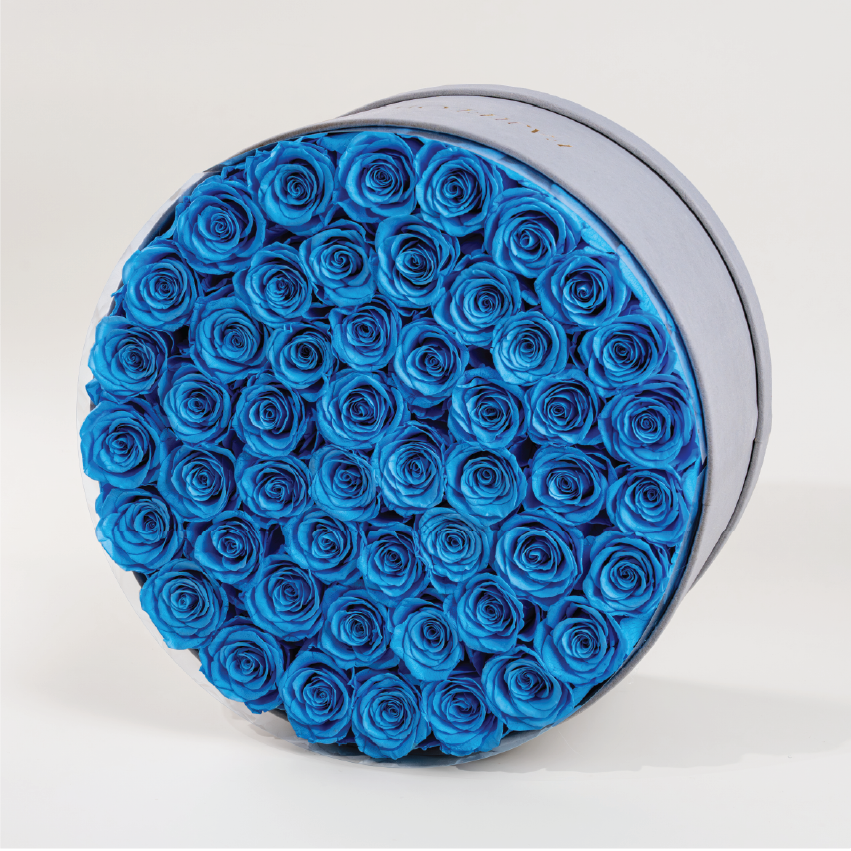 Our limited edition Blue 50 flat bouquet. This stunning round bouquet features 50 baby blue roses, each meticulously placed to form a bold and romantic display. At the centre, a custom monogram letter adds a personal touch, making it perfect for any occasion.